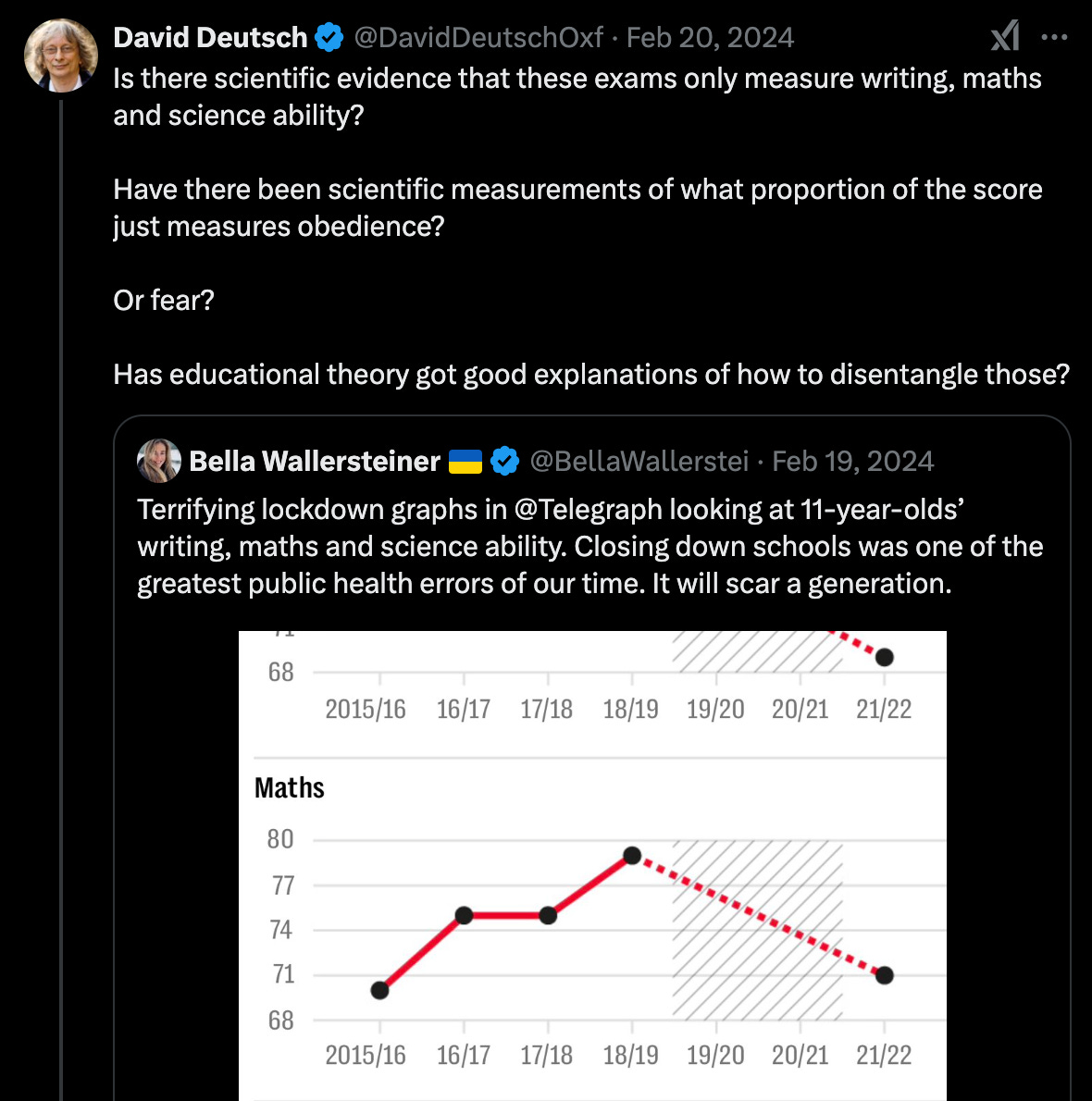 A major issue with these studies are the misinterpretations of them. As the common but much-flawed approach goes: we start with data and then find a theory to fit it. We test it over and over, affirming our theory we found in the data. But that's not how it works. We actually start with an idea about how students learn, and then test it—seeking criticism, not affirmation (Sorry, Haidt). A faulty interpretation of ‘following the data’ leads people to think falling test scores mean children aren’t learning, or learning less. But rest assured, they are learning—all the time. They’re just not learning or demonstrating their knowledge of the stuff adults impose on them. And they have that right! It’s the rules and coercion schools use that typically push students into taking tests, not their interests.