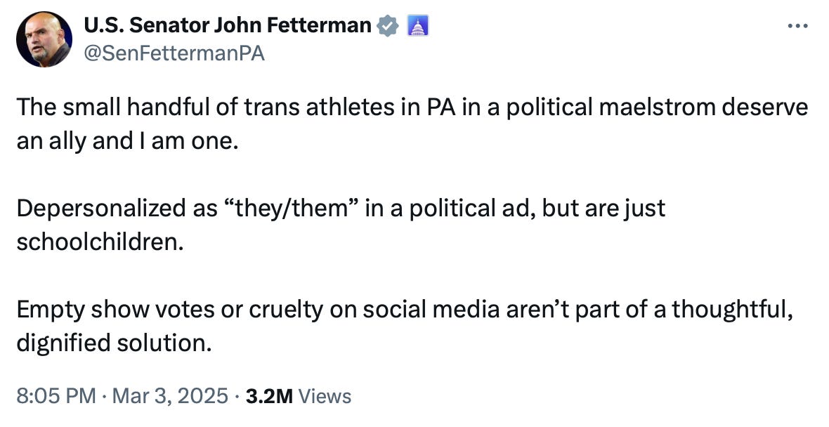 Fetterman represents a large Trump-won swing state. I haven’t seen evidence Fetterman has risked success for his party in Pennsylvania by taking popular positions. And nor will you, because his priority is winning elections in a purple state.