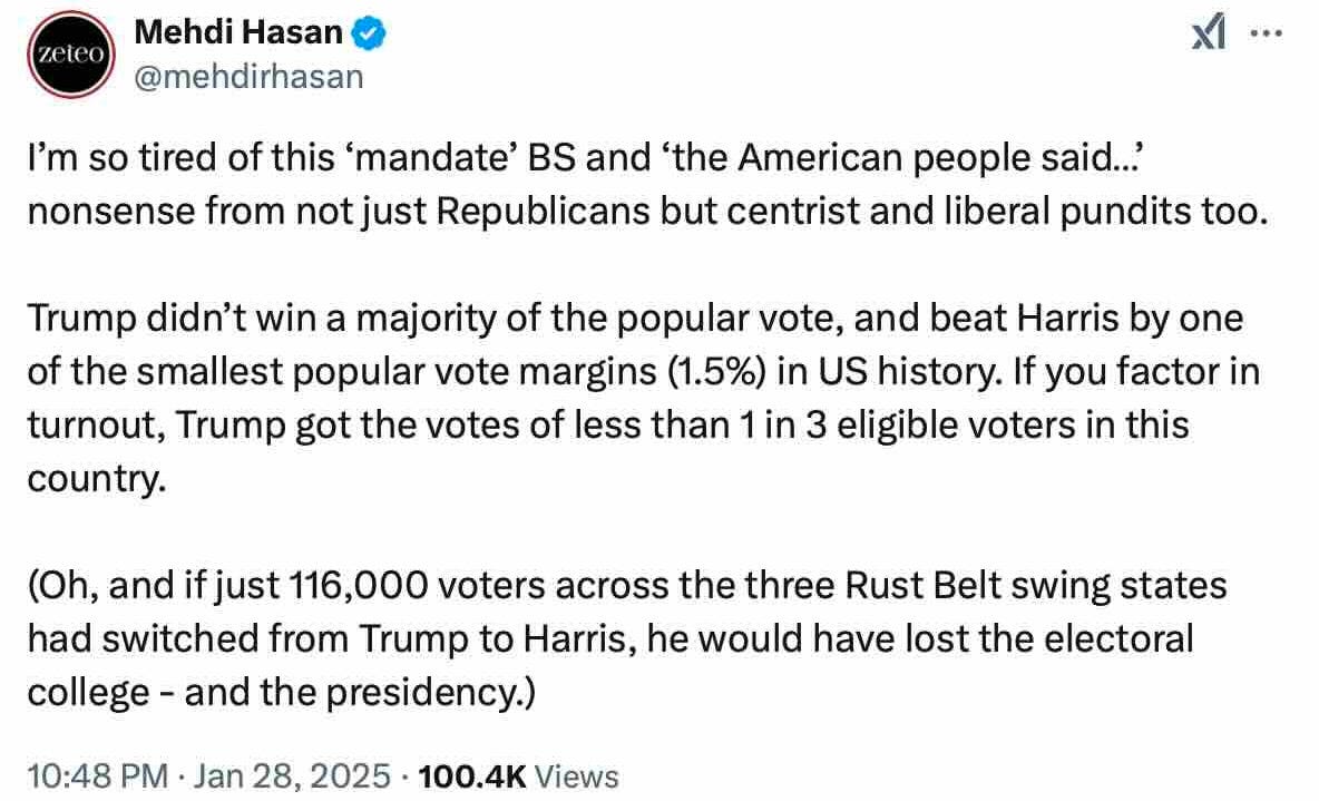Trump has been clear about his belief that he now has a mandate from American voters to push his agenda on a large scale, including mass deportations, high tariffs on allies, and expanding executive powers. Some on the left, like Mehdi Hasan, have pushed back against this idea, pointing to his win in comparison to historical electoral records and the narrowness of the results.