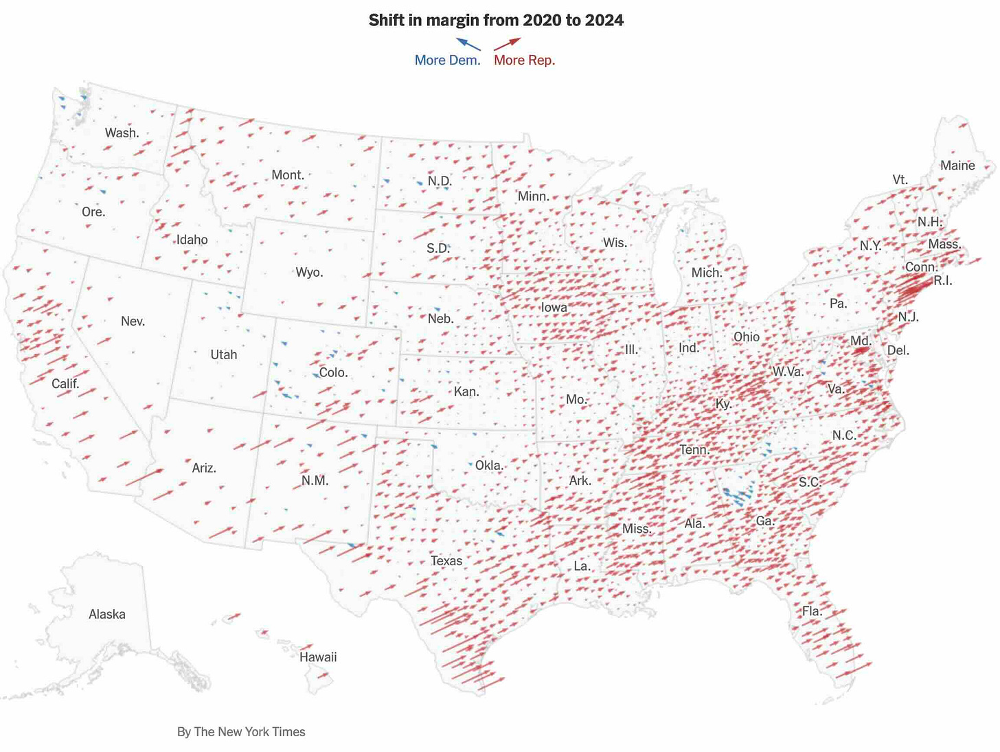 Beyond particular state legislatures, the country shifted to the right when it came to the presidential elections compared to 2020, as visualized by the New York Times: more than 89 percent of counties in the United States shifted in favor of President Trump.