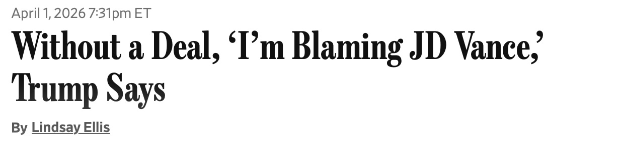 I try to avoid cynical theories and conspiracies, but this theory doesn’t require assuming bad faith. If there’s one thing Trump is an expert on it may just be publicity—how to foster it, control it, spin it, and so on. It’s possible the decision to send Vance was simply tactical: if Trump was going to be with Joe Rogan at a UFC event, he might as well send the second-highest-profile envoy to handle the moment. A more nuanced reading is that Trump deliberately placed Vance on the mission to neutralize any future criticism from him regarding Iran (not that he would do so publicly anyway). And that would’ve been a smart play: it’s hard to credibly distance yourself from a war you were publicly sent to help end.