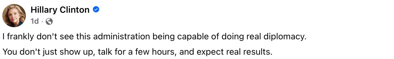 But the pattern of Trump humiliating and targeting dissenters predates this single mission. It’s even possible the negotiations were another farcical performance as the Admin conjures up their real intentions in the Situation Room. Clinton herself noted that the original negotiations in February were unrealistic, and expressed shock that Trump claimed no one told him Iran might close the Strait of Hormuz.