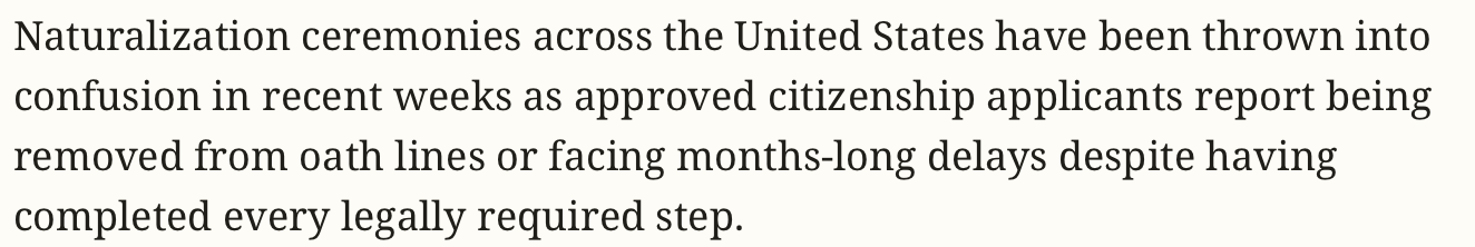 Removing and denying individuals from certain countries who have undergone the rigorous process of becoming U.S. citizens (which includes learning English, understanding American history, and navigating numerous interviews and forms) from their naturalization ceremonies should itself be a criminal offense. But almost everyone notices the tinge of racism undergirding the entire operation.