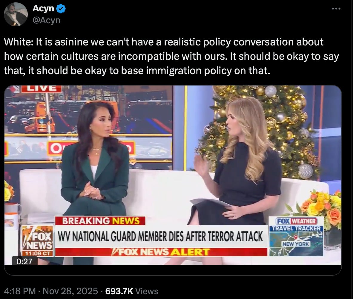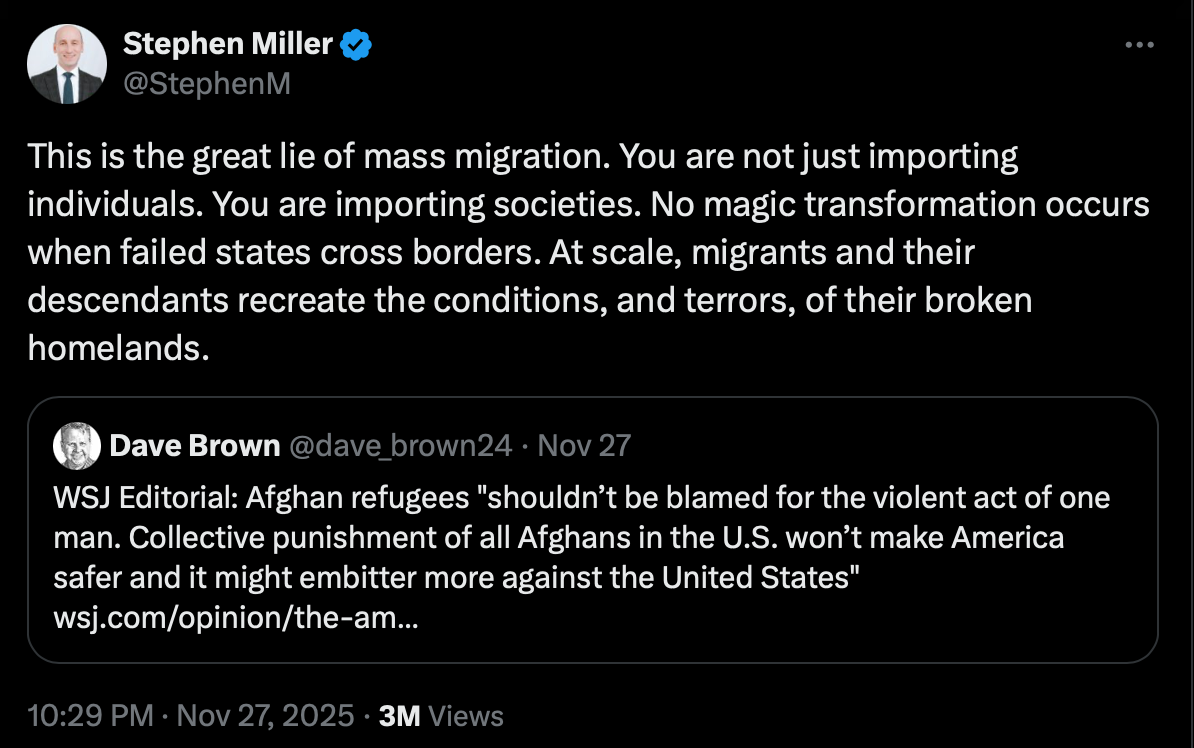 This is the part Republicans generally get right: we’re not just importing individuals, we’re importing ideas. I’m just not convinced Republicans know what actually separates those things. Too often, they make ideology sound inherent—essential—to one’s nationality, ethnicity, or environment. But identity tells us nothing about a person’s commitment to a particular set of ideas (you would think anti-woke folks would understand that).