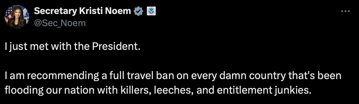 Homeland Security Secretary Kristi Noem doesn’t cite specific data on violence or individual screening mechanisms for this recommendation: the justification is entirely rooted in a generalized stigma of certain kinds of people.